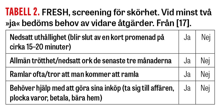FRESH är ett screeningsinstrument som relativt nyligen har utvecklats vid Sahlgrenska universitetssjukhuset och används på sjukhusets alla akutmottagningar. Det består av fyra enkla uppgifter, se Tabell 2 [17]. Två positiva svar indikerar behov av vidare åtgärder: vid Sahlgrenska får patienterna då till exempel bättre madrasser, tillsynsrond med bland annat mat/dryck och hjälp till toalett under vistelsen på akutmottagningen. Instrumentet används också på de kirurgiska avdelningarna för att avgöra vilka som ska bedömas av geriatrisk konsult. Modellen har visat goda psykometriska egenskaper samt god sensitivitet (0,81) och specificitet (0,8) med fenotypmodellen som jämförelse. Resultaten blir dikotomt – skör eller robust.