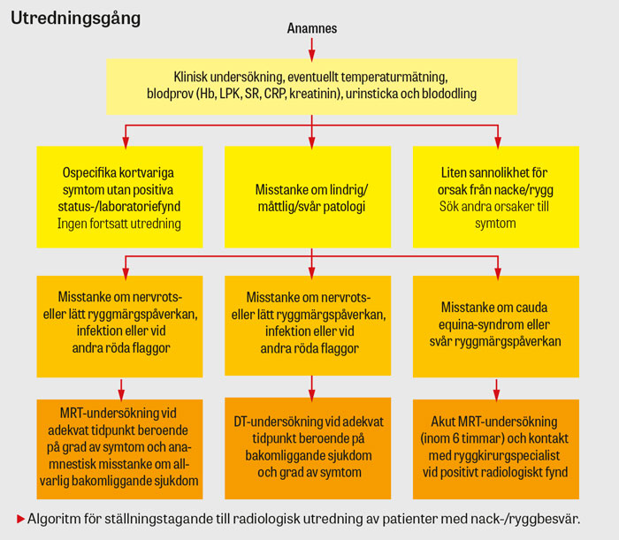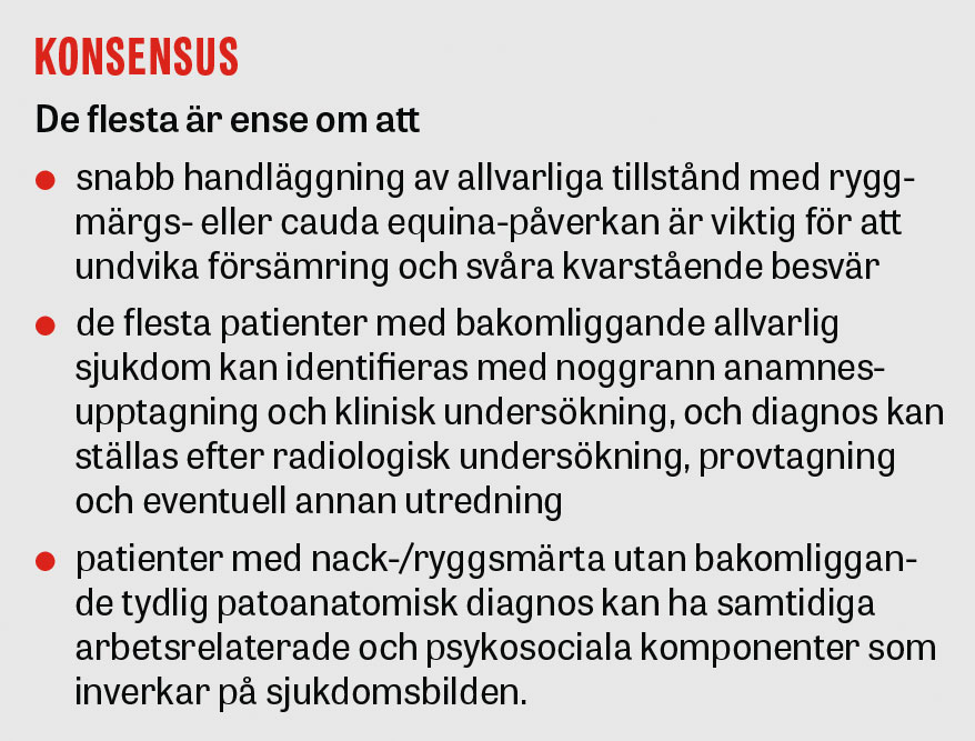 Besvär och smärta i nack- och ryggregionen drabbar upp till 70–80 procent av befolkningen och är bland de tillstånd som orsakar högst sjukfrånvaro i Sverige. Psykologiska faktorer har visats vara bidragande såväl vid akuta tillstånd som vid utveckling av kroniska ospecifika nack- och ryggbesvär och kan medverka till nedsatt arbetsförmåga [1]. Det är viktigt att så snart som möjligt bekräfta eller utesluta allvarliga tillstånd och därefter kunna hänvisa till lämplig behandling.