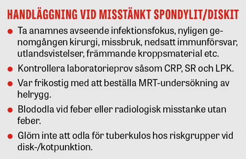 Provtagning. Initial provtagning där sådan bedöms indicerad vid oklar nack-/ryggsmärta bör inkludera temperatur, Hb, LPK, SR, CRP, kreatinin och urinsticka. Vid feber eller misstanke om spondylit/diskit bör blododling övervägas. Vid misstanke om cauda equina-syndrom bör residualurin kontrolleras med bladderscan. Vid blåsdysfunktion är dränering av urinblåsan med KAD mycket viktig för att undvika bestående blåsskada.