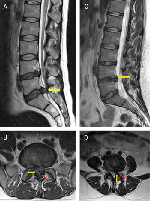 Patienter med cauda equina-syndrom på L 5–S 1-nivå i A) sagittal- och B) axialplan respektive typiskt diskbråck på L 4–L 5-nivå i C) sagittal- och D) axialplan. Diskutbuktningarna har markerats med gula pilar, medan durasäcken (B) respektive nervroten (D) markerats med röda pilar.