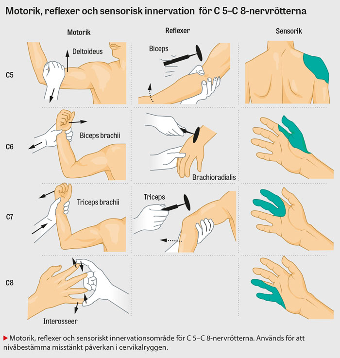 Motorik, reflexer och sensorisk innervation för C 5–C 8-nervrötterna