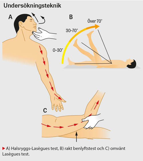 Genomför sensibilitetstestning utefter dermatomen. Ridbyxeanestesi och nedsatt sensibilitet perianalt inger misstanke om cauda equina-syndrom. Undersök biceps-, brachioradialis-, triceps-, patellar-, akilles- och indirekt vadreflex samt fotklonus, Babinskis tecken och Hoffmans test. Skilj rotpåverkan med försvagade reflexer från ryggmärgspåverkan som ger stegrade reflexer, eventuellt positivt Babinskis tecken, positivt Hoffmans test och/eller fotklonus. Raka benlyftstestet (straight leg raising test; SLR) betraktas som positivt vid ipsilateral smärtutstrålning nedanför knät vid lyft under 70°.