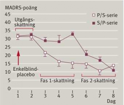 Resultatet blev att de som först fick skopolamin redan efter första infusionen skilde sig signifikant från utgångsläget och från gruppen som fick placebo vad gäller MADRS, HARS (Hamilton Anxiety Rating Scale) och CGI-I (Clinical Global Impression-Improvement). Effekten tilltog efter påföljande infusioner och kvarstod under de följande tre placeboinfusionerna.