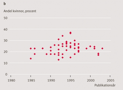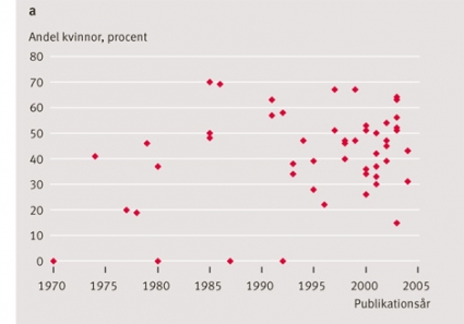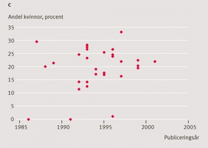 Kvinnorepresentationen över tid. För samtliga indikationer uppvisar andelen kvinnor i studierna stor spridning (Figur 1a–c). Någon uppenbar trend över tid kan inte observeras, beträffande vare sig nivå eller spridning. För preventionsstudier vid hypertoni ligger kvinnorepresentationen i genomsnitt strax under 50 procent. Motsvarande siffra för akut hjärtinfarkt och hjärtsvikt är cirka 25 respektive 20 procent. Av de studier som helt eller nästan helt saknar kvinnor är fyra utförda av Veterans Administration, som ansvarar för sjukvården för amerikanska krigsveteraner, en grupp som nästan uteslutande då bestod av män.