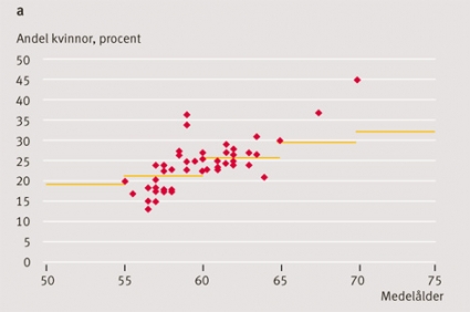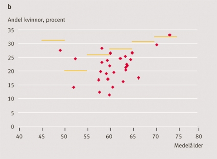 Kvinnorepresentationen i relation till könsspecifik prevalens. Av Figur 2a, som relaterar andelen kvinnor till medelålder vid inklusion och kvinnors andel av antalet slutenvårdstillfällen för akut hjärtinfarkt, framgår att könsfördelningen i studierna väl återspeglar den könsspecifika prevalensen. För hjärtsvikt däremot kan en viss underrepresentation konstateras (Figur 2b). Den är i genomsnitt dock inte större än knappt fem procentenheter.
