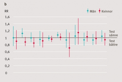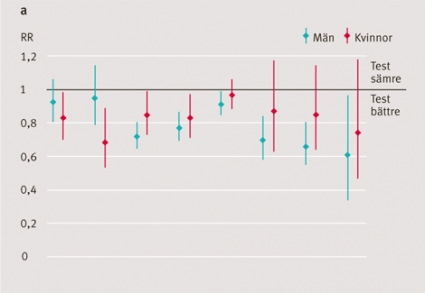 Tillförlitligheten i könsspecifika resultat. Det är i regel endast i de större hjärtinfarktstudierna som resultaten har redovisats uppdelade på kön. I Figur 3a och b redovisas relativ risk för död inom 28–35 dagar med 95 procents konfidensintervall för de båda könen. Av punktskattningarna framgår att den observerade effektstorleken ofta inte skiljer sig mycket mellan könen. Vidare är konfidensintervallens längd påfallande lika trots att antalet kvinnor i studierna är lägre, vilket beror på att mortaliteten bland kvinnor i de studerade åldersgrupperna som får en hjärtinfarkt är högre än hos män. Med fler förväntade dödsfall kan man dra säkra slutsatser på färre individer. I studier som påvisat en skillnad för hela studiepopulationen (Figur 3a) är den slutsatsen statistiskt säkerställd (övre konfidensintervallsgränsen ligger under 1) för kvinnor i fyra studier av åtta, medan motsvarande gäller för män i sex studier av åtta. Studier som inte påvisat en skillnad i hela studiepopulationen (Figur 3b), ofta så kallade non-inferiority-studier med syfte att visa att testbehandlingen är minst lika bra som kontrollbehandlingen, är den slutsatsen minst lika säker eller säkrare för kvinnor än för män i åtta studier av elva (övre konfidensintervallsgränsen lägre för kvinnor än för män).
