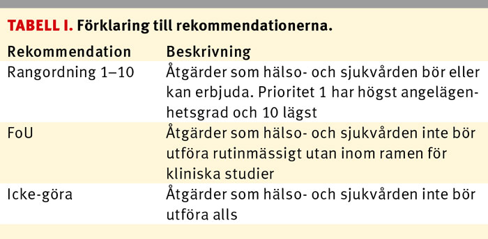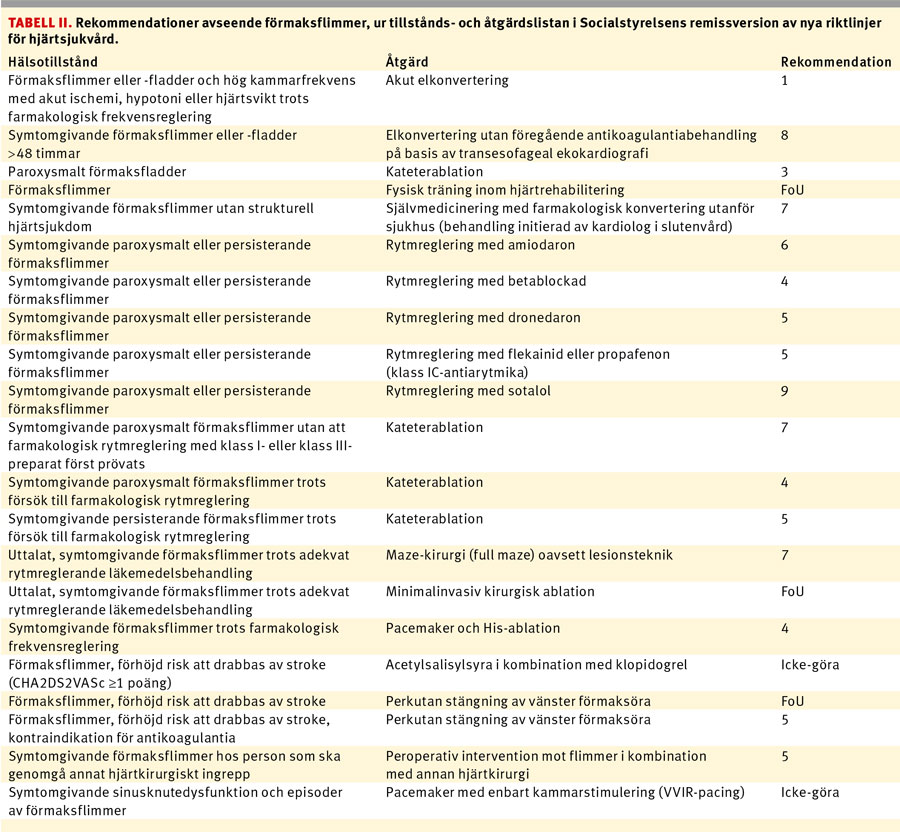 Samtliga rekommendationer presenteras i tillstånds- och åtgärdslistan, där 30 av knappt 170 rekommendationer handlar om förmaksflimmer. Det finns tre olika typer av rekommendationer: rekommendation med rangordning 1–10, rekommendationen FoU och rekommendationen icke-göra (Tabell I). Rangordningen baseras på en samlad bedömning av