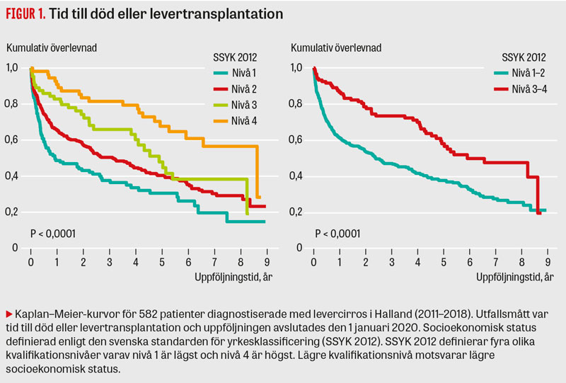 I en uppföljningsstudie av 582 patienter studerades samband mellan socioekonomi och tid till död eller levertransplantation [2]. Uppföljningen avslutades den 1 januari 2020. Patienternas socioekonomiska status definierades med utgångspunkt i den svenska standarden för yrkesklassificering (SSYK 2012). SSYK 2012 definierar fyra kvalifikationsnivåer: Nivå 1 motsvarar yrken med inga eller låga formella utbildningskrav. Nivå 2 motsvarar yrken som ofta kräver gymnasial utbildning samt eftergymnasiala utbildningar upp till 2 år. Nivå 3 omfattar yrken med krav på praktiska eller yrkesspecifika eftergymnasiala utbildningar om 2–3 år. Nivå 4 omfattar yrken där det krävs eftergymnasiala utbildningar om minst 3 år, normalt 4 år eller längre.