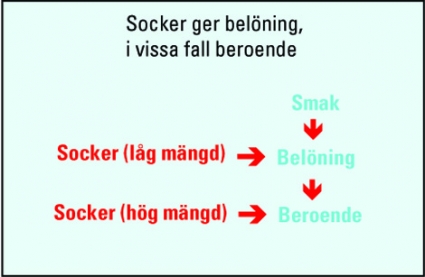 Sammanfattningsvis kunde alltså i en experimentell djurmodell socker som dryck framkalla ett beroende, som beteendemässigt och kemiskt liknade det beroende som andra droger framkallar. Vilken är då mekanismen för det iakttagna beroendet, och är detta relevant för människa?