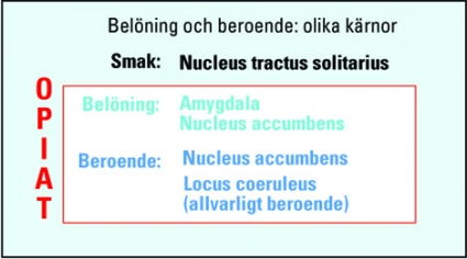 För att få svar på frågan om belöning och beroende hör ihop måste vi därför gå till djurförsök. Det finns nämligen experiment som visar att låg halt av socker (10 procent) ger belöning utan abstinenssymtom [13], medan hög halt (25 procent) ger belöning och abstinenssymtom, dvs beroende [1]. En analys av de två experimenten visar att den låga sockermängden gav opiatinducerade förändringar i amygdala, medan den höga sockermängden gav förändringar i nucleus accumbens. Amygdala är en kärna i ventromediala hypotalamus, och den ingår i det limbiska systemet. Amygdala förmedlar belöning och påverkas av flera olika aptitreglerande peptider, tex leptin, enterostatin och kolecystokinin, som antingen höjer eller minskar belöningen. Nucleus accumbens är en kärna i laterala hypotalamus. Den har också en belöningsfunktion, men står samtidigt i förbindelse med motoriska neuron och kan framkalla abstinenssymtom (Figur 3).