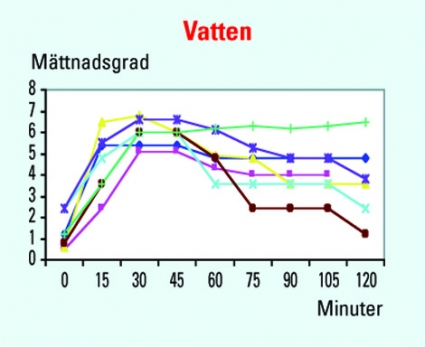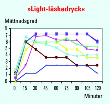 I en undersökning utförd i mitt laboratorium fick 20 personer äta en portion hamburgare och pommes frites antingen tillsammans med kolsyrat vatten eller med »light-läskedryck«, varefter mättnaden skattades [opubl data]. Det visade sig att de som druckit vatten blev mätta på ett likartat sätt, medan bilden av mättnad var mer splittrad hos dem som druckit »light-läsk«. En del förblev hungriga efter måltiden, andra var mätta under lång tid (Figur 4).