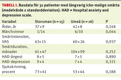 Patienternas basdata presenteras i Tabell I. Den enda signifikanta skillnaden mellan Storumangruppen och Smärtrehabgruppen var könsfördelningen.