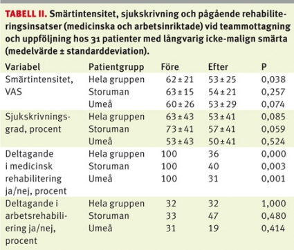 Vid uppföljning var 11/15 Storumanpatienter och 10/16 Umeåpatienter nöjda med teammottagningen. Smärtintensitet, sjukskrivning och pågående rehabiliteringsinsatser vid teammottagning och uppföljning presenteras i Tabell II. Hela patientgruppen hade signifikant lägre smärtintensitet enligt VAS vid uppföljning jämfört med vid mottagningstillfället. Mellan de två undergrupperna förelåg dock inga signifikanta skillnader.