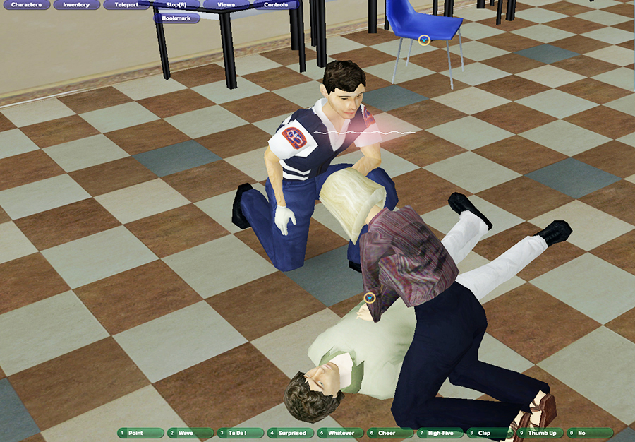 Bild från spelmiljön som visar en deltagare som utför hjärt–lungräddning på väg att lämna över till en ambulanssjukvårdare. Patienten på marken är också (liksom de andra) en avatar och sköts/spelas av instruktören/tränaren. Med tillstånd från Forterra/SAIC.
