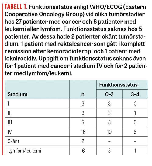 Funktionsstatus vid första läkarbesöket på ESCU var registrerat i journalen hos 33 (87 procent) av patienterna med malign sjukdom. Funktionsstatus 0–2 förekom hos 25 patienter och funktionsstatus 3–4 hos 8 patienter. Patienter med lokaliserad cancersjukdom hade god funktionsnivå (10/11 patienter, funktionsstatus 0–2) vid diagnostillfället. En dryg tredjedel (6/16) av patienter med generaliserad cancer vid diagnostillfället hade funktionsnivå 3–4. Vid lymfom/leukemi hade 5 patienter funktionsstatus 0–2 och 1 patient 3–4. För detaljer se Tabell 1.