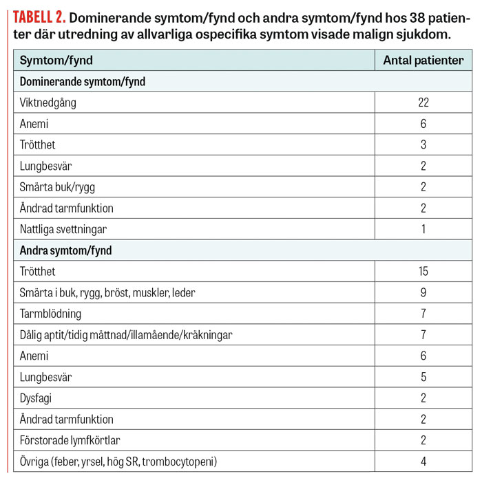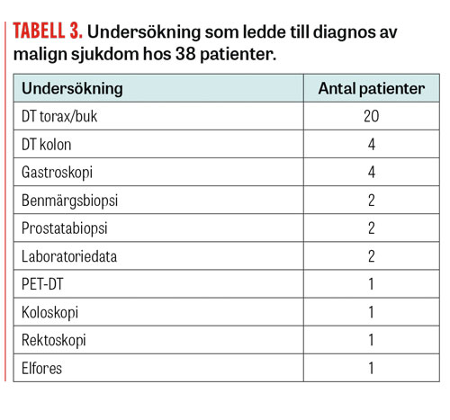 Dominerande symtom och andra symtom i cancergruppen redovisas i Tabell 2. Fyra symtom noterades hos 6 patienter, tre symtom hos 18 patienter, två symtom hos 11 patienter och ett symtom hos 3 patienter. Utredningen startade ofta med undersökning med datortomografi av torax/buk, vilken kunde avslöja cancer hos 20 av patienterna (Tabell 3). Som framgår av Tabell 4 var lungcancer och tarmcancer vanligast, men även lymfom var relativt vanligt förekommande.