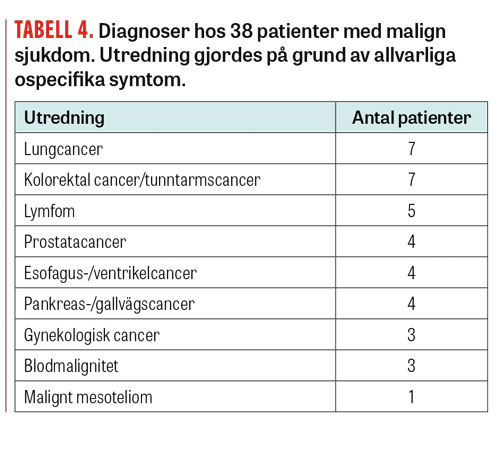 38 patienter (26 procent) fick efter utredning en malignitet diagnostiserad, medan misstanken om malign sjukdom kunde avskrivas hos 108 patienter (74 procent). Medianåldern var 75 år (48–91 år) för de patienter som fick diagnosen cancer eller malign blodsjukdom, och det var fler män (n = 24) än kvinnor (n = 14). Medianåldern för de patienter där misstanken om malign sjukdom kunde avskrivas var 70 år (23–93 år). I denna grupp fanns 61 män och 47 kvinnor.