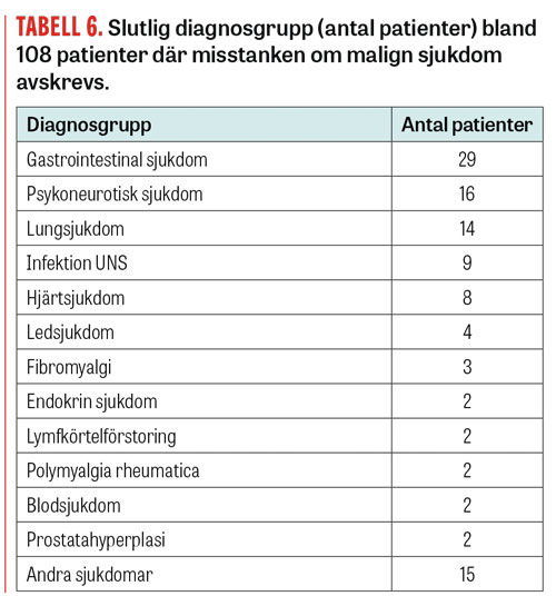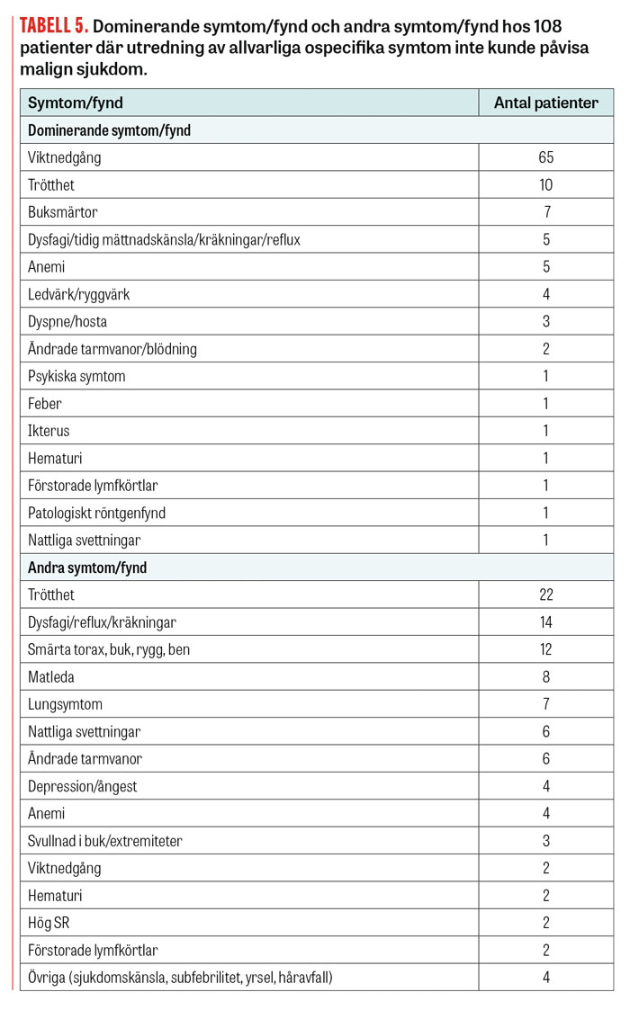 Dominerande symtom och andra symtom (ett eller flera hos samma patient) hos 108 patienter där utredning av allvarliga ospecifika symtom inte kunde påvisa malign sjukdom visas i Tabell 5. Ett symtom förekom hos 34 patienter, två symtom hos 47 patienter och tre symtom hos 27 patienter. I genomsnitt hade patienterna utan cancersjukdom 1,9 symtom, vilket kan jämföras med patienter som fick en cancerdiagnos, där 2,7 symtom förekom i genomsnitt. Sammanlagt ställdes ca 60 olika diagnoser hos patienter utan cancerdiagnos. Slutliga diagnosgrupper ses i Tabell 6.