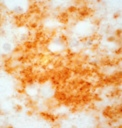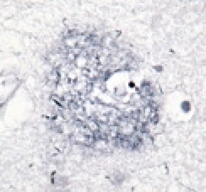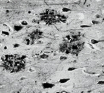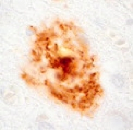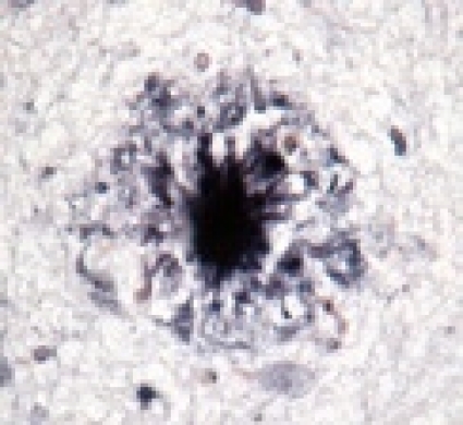 I studien »The occult aftermath of boxing« [44] kunde man med immunhistokemi påvisa utfällning av (beta)-amyloid till senila plack, vilka annars anses vara patognomona för Alzheimers sjukdom (Figur 3). Det finns olika former av plack: »diffusa plack« antas vara ett förstadium bestående endast av aggregerad (beta)-amyloid (Figur 5), medan »neuritiska« eller »klassiska« plack består av en central kärna av hårdare aggregerad (beta)-amyloid omgiven av degenererade neuriter samt astrocyter och mikroglia (Figur 5).