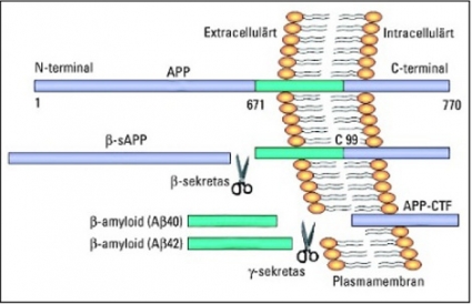 (beta)-amyloid bildas från ett moderprotein kallat amyloid-prekursorprotein (APP) (Figur 6). Det bildas olika varianter av (beta)-amyloid med antingen 40 (A(beta)40) eller 42 (A(beta)42) aminosyror (Figur 6). Normalt bildas mest A(beta)40, medan A(beta)42 är den dominerande formen i senila plack, eftersom det är mer hydrofobt och därmed har en tendens att aggregera.