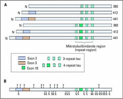 Förekomst av tangles vid CTBI-B har verifierats i flera studier [43-45] och har beskrivits hos professionella boxare redan i 20-årsåldern [46]. Tangles bildas i nervcellernas cytoplasma (Figur 3) och består av trådformade proteinaggregat av hyperfosforylerat tau [47]. Det finns sex olika isoformer av tau och ett flertal aminosyror som kan fosforyleras (Figur 4). Tau stabiliserar mikrotubuli i nervcellernas axoner, vilket är av stor betydelse för axonal transport och därmed för nervcellernas funktion. Hyperfosforylerat tau har försämrad funktion och får också en benägenhet att aggregera och bilda tangles.