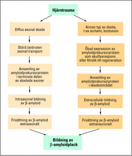 Litteraturen talar för att såväl akut traumatisk hjärnskada som CTBI-B leder till neurokemiska förändringar liknande dem vid Alzheimers sjukdom, och att samma sårbarhetsgen (APOE) är av betydelse för CTBI-B och Alzheimers sjukdom. Ett flertal epidemiologiska studier har också visat att tidigare hjärntrauman är en tydlig riskfaktor för Alzheimers sjukdom [72]. Vad är då känt om APP och (beta)-amyloid (de proteiner som anses vara centrala vid Alzheimers sjukdom) vid hjärntrauma?