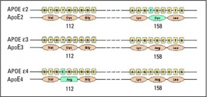 Det finns tre olika alleler (APOE (epsilon)2, (epsilon)3 och (epsilon)4) av APOE-genen som kodar för motsvarade tre isoformer (ApoE2, ApoE3 och ApoE4) (Figur 7). APOE (epsilon)3 är den vanligaste allelen i befolkningen. APOE (epsilon)4-allelen är en stark riskfaktor för Alzheimers sjukdom, risken att insjukna är 3–4 gånger större hos personer med en APOE (epsilon)4-allel och 8–10 gånger större hos dem med två APOE (epsilon)4-alleler än hos personer som saknar APOE (epsilon)4-allelen [62].