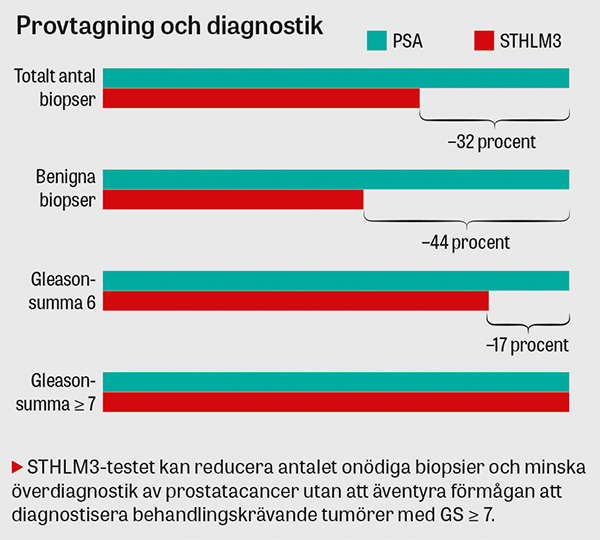 Användes samma sensitivitet för GS ≥ 7-tumörer som för PSA ≥ 3 ng/ml undvek man med STHLM3-testet 32 procent (95 procents konfidensintervall [KI] 24–39 procent) av vävnadsprovtagningarna och 44 procent (95 procents KI 35–54 procent) av vävnadsprovtagningarna med benignt utfall, samtidigt som diagnostisering av 17 procent (95 procents KI 7–26 procent) av låggradiga tumörer (GS ≤ 6) undveks.
