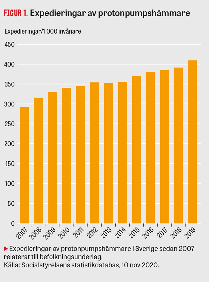 Det råder ingen tvekan om att behandlingen med protonpumpshämmare (PPI) har revolutionerat hanteringen av syrarelaterade sjukdomar. De kliniska resultaten är mycket bra [1, 2] och överlägsna dem som kunde uppnås med histamin-2-receptorantagonister. Användningen av protonpumpshämmare fortsätter att öka varje år i Sverige, liksom i alla länder där den noggrant studerats (Figur 1). Ökningen verkar vara mest framträdande hos kvinnor och hos den äldre delen av befolkningen [3-5].