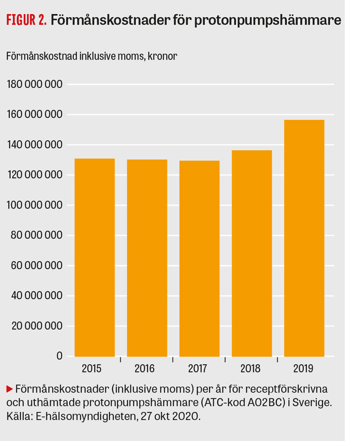 Överanvändning/missbruk av protonpumpshämmare, som beskrivs ovan, medför en ökning av samhällets kostnader. Internationella beräkningar har gjort gällande att upp till två miljarder brittiska pund spenderas i onödan på protonpumpshämmare varje år [25, 26]. En annan studie beräknade apotekskostnaderna under en 4-årsperiod hos mer än 20 000 patienter, som fått behandling med protonpumpshämmare baserad på felaktiga indikationer, och fann att den totala kostnaden var ca 3 000 000 US-dollar. Låt oss då anta att ca 50 procent av Sveriges förbrukning av protonpumpshämmare kan ifrågasättas på vetenskapliga och kliniska grunder. Med en kostnad för den årliga, receptbaserade svenska förbrukningen av protonpumpshämmare på 160 000 000 kronor i 2019 års penningvärde (Figur 2) är det uppenbart att frågan har stor medicinsk och hälsoekonomisk relevans. Nog kan dessa pengar användas på bättre sätt. Med en fortsatt expansion av digitalisering av vården, ökning av icke receptbunden förbrukning av protonpumpshämmare (OTC, försäljning över disk) och växande utbud av nätbaserade medicinska konsultationer är det rimligt att anta att denna problematik kommer att växa sig allt större.