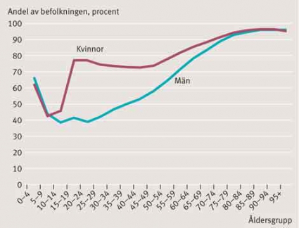 År 2009 köpte 6,2 miljoner (67 procent) av befolkningen, 2,7 miljoner (59 procent) män och 3,5 miljoner (75 procent) kvinnor, minst ett receptförskrivet läkemedel. Andelen var högst bland de äldre. I åldrarna 65 år och uppåt behandlades mer än 80 procent av befolkningen med receptförskrivna läkemedel. I alla åldersgrupper utom bland de yngsta (0–4 år) var läkemedelsuttag vanligare bland kvinnor. Störst könsskillnad fanns i åldersgruppen 20–24 år, och denna minskade därefter för att jämnas ut hos individer över 80 år (Figur 1). Könsskillnaden bland individer mellan 15 och 44 år, som i genomsnitt ligger på 29 procentenheter, förklaras till stor del av kvinnors p-pilleranvändning, men även om p-piller exkluderades var andelen med utköp högre bland kvinnor än bland män.