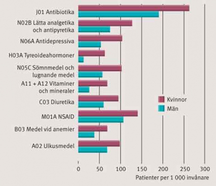 Den läkemedelsgrupp som användes av flest individer var antibiotika (J01). Mer än var femte svensk, 19 procent av männen och 26 procent av kvinnorna, köpte ut antibiotika minst en gång under året. Antibiotika var också den läkemedelsgrupp där skillnaden i användning mellan kvinnor och män i absoluta tal var som störst (Figur 2). Bland små barn (0–4 år) var det dock vanligare att pojkar fick antibiotika. Andra läkemedelsgrupper där den totala användningen var högre hos kvinnor var analgetika/antipyretika, antidepressiva, tyreoideapreparat, sömnmedel och lugnande medel, vitaminer och mineraler, diuretika, NSAID-preparat, medel vid anemier och ulkusmedel.