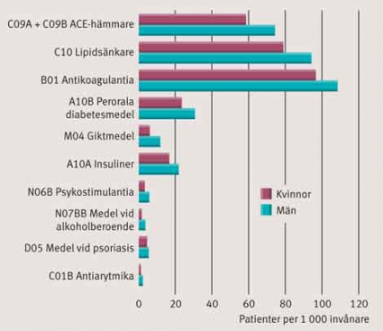 Bland läkemedelsgrupper där den totala läkemedelsanvändningen var högre hos män låg ACE-hämmare i topp (Figur 3). Män använde också i större utsträckning lipidsänkare, antikoagulantia, diabetesmedel (både perorala och insulin), giktmedel, psykostimulantia, medel vid alkoholberoende, medel vid psoriasis och antiarytmika.