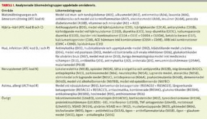 Analyserade data omfattar befolkningens samtliga utköp av receptförskrivna läkemedel under 2009. Analyserna baseras på ett urval av läkemedelsgrupper på olika ATC-kodsnivåer (Tabell I). Läkemedelsgrupperna valdes för att få avgränsade terapiområden inom vilka läkemedlen huvudsakligen förskrivs på recept. De överensstämmer också med den uppdelning som görs av Socialstyrelsen i den nationella årsstatistiken [1]. Läkemedelsgrupper som uteslutande används till kvinnor eller till män, t ex könshormon- och potensmedel, har exkluderats.