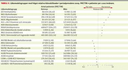 De läkemedelsgrupper med störst skillnad mellan kvinnor och män i absoluta tal var vanliga läkemedel som antibiotika, analgetika och hjärt–kärlläkemedel. Om man i stället analyserade de relativa könsskillnaderna var det en del andra läkemedelsgrupper som utmärkte sig och som inte hade så stor total användning men där könsskillnaderna relativt sett var stora (Tabell II). För vissa läkemedelsgrupper var dock skillnaderna stora i både absoluta och relativa tal.