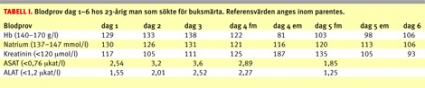 Sjukhistoria. Patienten kom in till S:t Görans sjukhus med två dagars anamnes på buksmärta. Han hade molande värk i hela buken men även intervaller av svårare värk. Han hade också svårt att tömma tarmen. Han var cirkulatoriskt stabil och feberfri. Blodprov visade normalt kreatinin och C-reaktivt protein (CRP), lindrig anemi (129 g/l), hyponatremi (130 mmol/l) och lätt förhöjt aspartat-aminotransferas (ASAT) och alanin-aminotransferas (ALAT) (se Tabell I, dag 1).