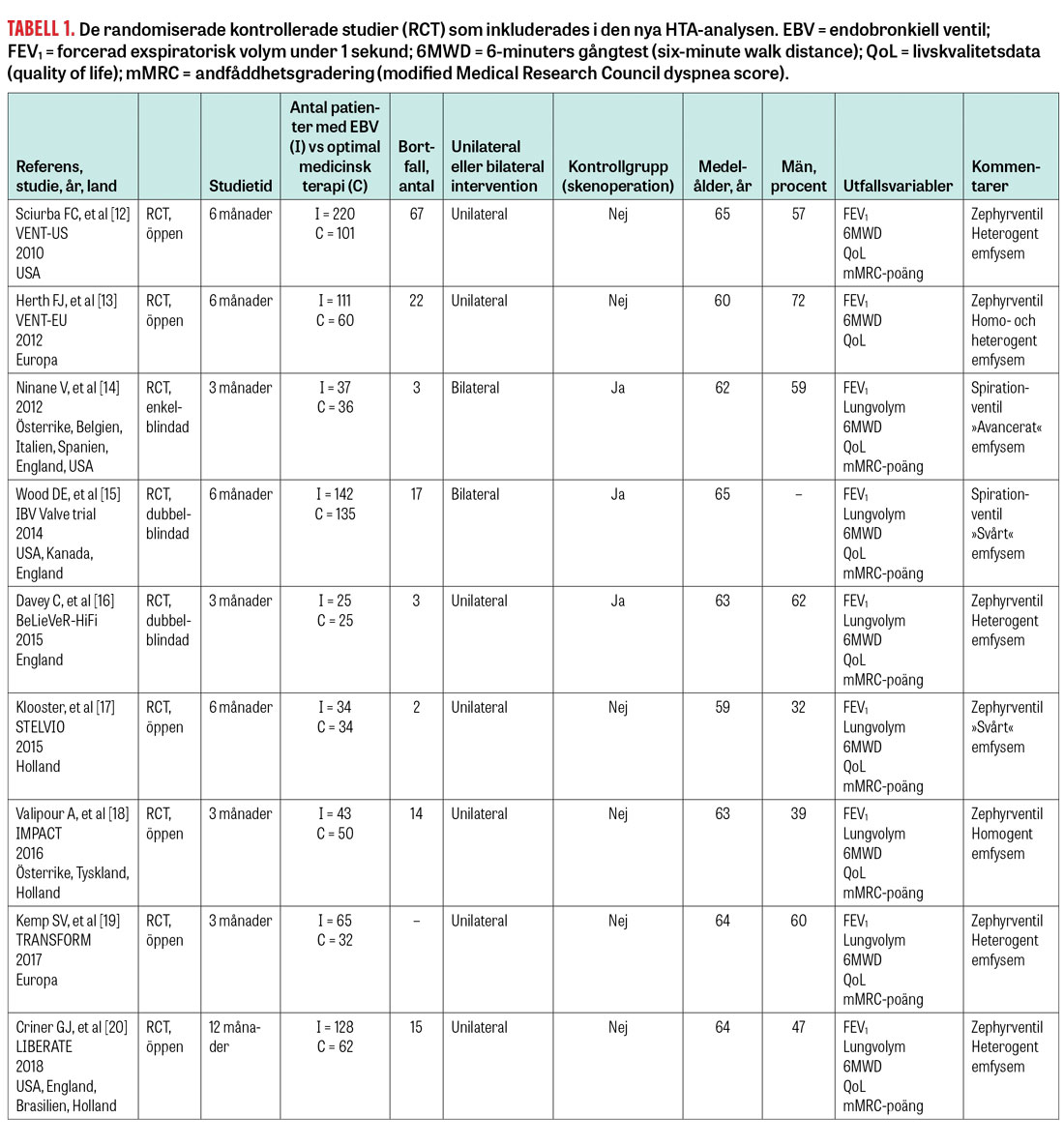 Totalt 9 RCT studerade effekterna av inläggning av endobronkiell ventil hos patienter med avancerat emfysem. Studierna redovisas i Tabell 1. I två av studierna har bägge lungorna erhållit ventiler, dvs bilateral behandling. I de övriga 7 studierna har ventilerna placerats unilateralt i en av lungorna.