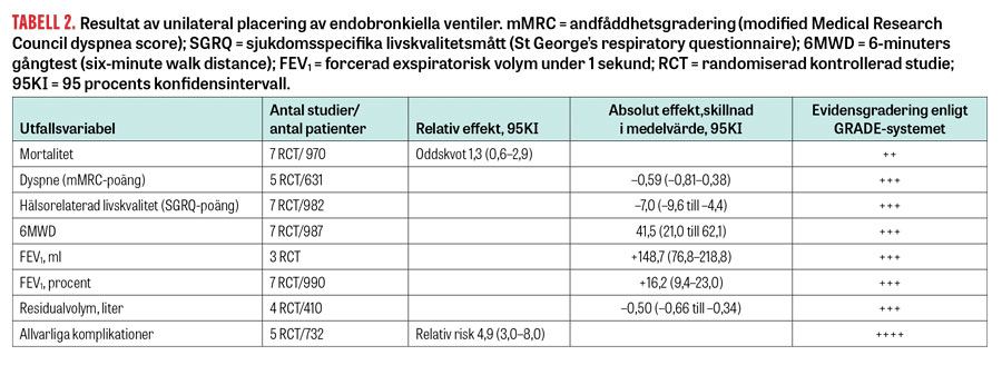 Behandling av patienter med avancerat emfysem och KOL med inläggning av endobronkiell ventil i affekterade lungsegment unilateralt förbättrade livskvalitet, fysisk prestationsförmåga och lungfunktion på ett kliniskt relevant sätt. Effekten verkade likartad vid både heterogent och homogent emfysem. Viktigt var att utesluta förekomst av kollateralventilation mellan lober, vilket undersöktes med högupplösande datortomografi (HRCT). Huruvida dessa effekter kvarstår under längre tid än 1 år och överlevnaden påverkas positivt behöver studeras i långtidsstudier.