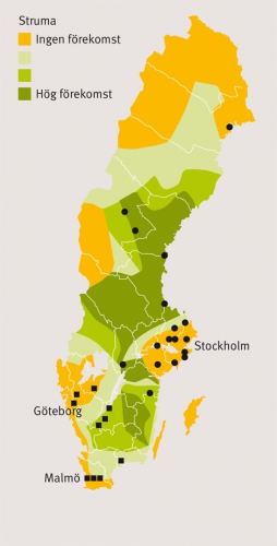 I Sverige beskrevs struma första gången av Carl von Linné 1746–1747 [29], och vid slutet av 1800-talet förekom struma hos 20–30 procent av barnen i Gästrikland och Dalarna [30]. Tjugo år senare hade strumaförekomsten ökat till 60–65 procent i dessa områden [31-34]. En nationell undersökning genomfördes 1929. Denna bekräftade endemisk strumaförekomst i Dalarna, Gästrikland, mellersta Norrland och Småland (Figur 1) [14, 35, 36], områden långt ifrån västerhavets saltinnehållande vindar [14] och den huvudsakliga föda som bidrog till jodintag: sill. Via s k sillforor transporterades denna till boende utmed handelsvägarna och de större städerna [37]. Jodbristområdena var kända under namnet »strumabältet«.