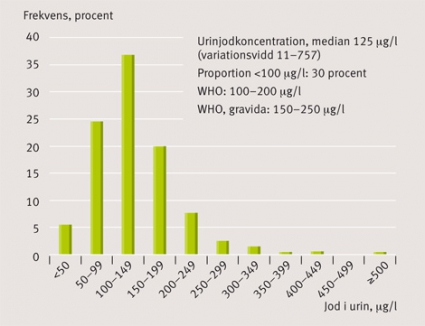 Swejodstudien genomfördes under hösten 2006 fram till våren 2007. Av 1 199 svenska skolbarn i åldern 6–12 år från 30 slumpvis utvalda skolor deltog 857 barn (74 procent) i UIC-studien [62] och 796 (66 procent) i Tvol-studien [63]. Median-UIC (Figur 2) var 125 µg/l (min–max 11–757; 95 procents konfidensintervall 120–130 µg/l) med en låg andel av barn med UIC <100 µg/l och >200 µg/l, vilket indikerar ett optimalt jodintag [62].