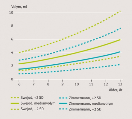 Ett validerat referensmaterial är dock nödvändigt, och detta har sammanställts internationellt flera gånger [57-59]. En tendens till minskad tyreoideavolym har noterats. I det senaste referensmaterialet från 2004 [60] studerades 3 529 skolbarn från områden som ansetts jodsufficienta sedan lång tid i Nord- och Sydamerika, Centraleuropa, östra Medelhavsområdet, Afrika och västra Stilla havs-området. Samma år publicerades också normativa tyreoideavolymer på skolbarn i Malmöområdet [61].