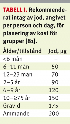 Den aktuella studien indikerar ett adekvat jodintag i den svenska befolkningen, men det garanterar inte att intaget av jod är tillräckligt under graviditet och amning. Under dessa perioder är jodbehovet större hos kvinnan, eftersom hon dels under graviditet har ökad produktion av tyroxin och förändrad clearence för jod i urin, dels under amning utsöndrar jod i bröstmjölken. WHO rekommenderar ett jodintag på 250 µg/dag till gravida och ammande [76]. Detta motsvarar median-UIC hos gravida kvinnor på 150–249 µg/l och ≥100 µg/l hos ammande kvinnor (den lägre UIC-nivån hos ammande kvinnor beror på jodutsöndringen i bröstmjölk) [76].