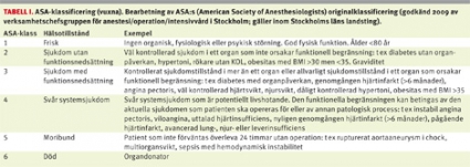 Preoperativt omhändertagande. Sammanlagt 70 procent av sjukhusen rapporterade att de hade en preoperativ mottagning där patienterna kunde bedömas. Vid de sjukhus som saknade mottagningsmöjlighet träffade man patienten på vårdavdelning dagen före kirurgi eller i samband med ingreppet. Alla anestesikliniker riskbedömde sina patienter enligt ASA-klassificering (American Society of Anaesthesiologists) (Tabell I). Andra klassificeringsmodeller för att identifiera högriskpatienter användes sällan: NYHA-klass (New York Heart Association) klassificerar grad av hjärtsvikt baserat på patientens symtom och användes vid 7 av 42 kliniker (17 procent), P-POSSUM (Portsmouth physiologic and operative severity score enumeration of mortality) [11] – ett klassificeringssystem baserat på både fysiologiska och operativa faktorer – användes vid 1 klinik (2 procent), Lee-index som predicerar kardiovaskulär mortalitet [12] användes vid 1 klinik (2 procent).