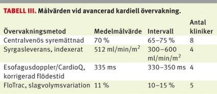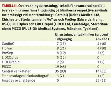 Peroperativt omhändertagande. Totalt 60 procent av klinikerna hade protokoll/rutiner för den peroperativa vätskebehandlingen. Klinikerna tillfrågades vilken utökad kardiovaskulär övervakningsutrustning som fanns på kliniken och vilken som användes rutinmässigt (förutom standardövervakning med noninvasivt blodtryck, EKG och saturationsmätning) (Tabell II). Riktlinjer för vilken typ av övervakning som skulle användas för olika patienter och vid olika ingrepp fanns på enbart 3 kliniker (7 procent). De kliniker som använde sig av utökad kardiovaskulär övervakning fick svara på vilka målvärden de strävade efter att uppnå (Tabell III).