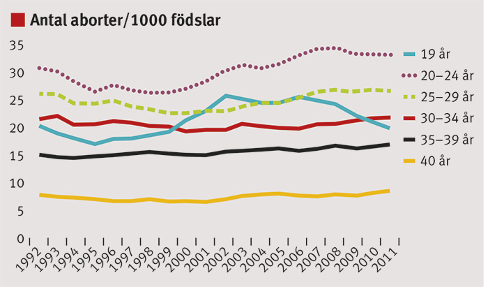 I Sverige föds cirka 110 000 barn/år, och det genomförs mellan 35 000 och 38 000 aborter/år [4]. Sverige har det högsta aborttalet i Norden, 20,9/1 000 kvinnor i fertil ålder (15–49 år), medan Finland har det lägsta 9,0/1 000 (Figur 1). Jämförande aborttal var i Norge 13,3, Island 12,6 och Danmark 13,6. Medan antalet aborter har legat stabilt de senaste åren i våra grannländer, har det ökat i Sverige (Figur 2). Abort är vanligast i åldersgruppen 20–24 år i hela Norden [7]. Antalet aborter bland tonåringar har minskat i alla nordiska länder under de senaste åren. Sverige har dock det högsta antalet aborter bland tonåringar. Flest tonårsgraviditeter fullföljs i Island, följt av Norge, Finland, Sverige och Danmark. Abortlagstiftning i de olika länderna kan delvis förklara skillnader mellan länderna [7].