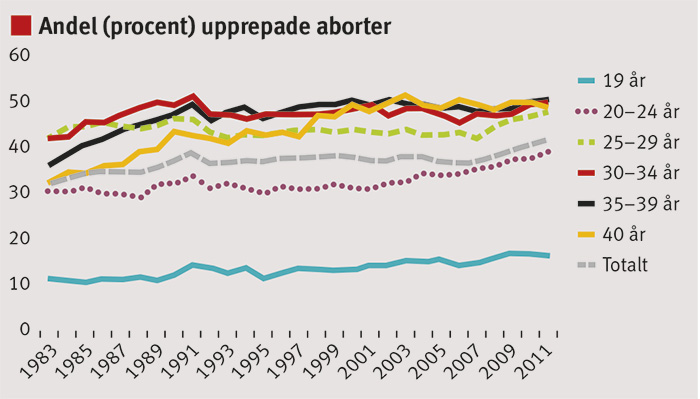 År 2011 hade fyra av tio abortsökande kvinnor i åldern 15–49 år (40,4 procent) erfarenhet av att ha gjort minst en tidigare abort [4], vilket kan jämföras med 36,5 procent i Finland, 39,0 procent i Norge, 34,7 procent i Danmark och 38,1 procent i Island. Tonårsaborterna i Sverige har minskat under de senaste åren, men andelen som gör upprepade aborter tenderar att öka bland unga (Figur 3).