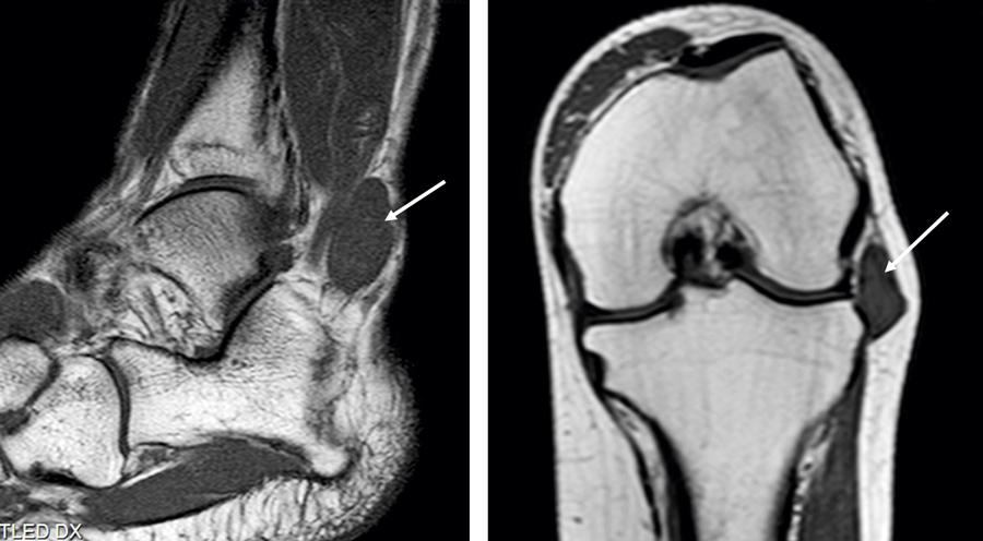Figur 1 och 2. Magnetisk resonanstomografi av laterala malleolen hos patient 1 (till vänster) samt knäleden hos patient 2 (till höger). Bedömningen blev hos båda patienterna initialt ganglion, men det visade sig sedan handla om synovialt sarkom.