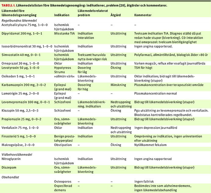 Stuporn tolkades som läkemedelsbiverkning, och ledde till utsättning av tre läkemedel (Tabell I). Standardiserade sym-tomskattningsformulär för att upptäcka frekventa läkemedelsbiverkningar används numera i flera landsting [9]. Nedsatt vakenhetsgrad (trötthet, dåsighet) räknas som en vanlig läkemedelsbiverkning och ingår i formuläret [9]. Stupor får dock förmodas vara mycket sällsynt. Att ha i åtanke att ett symtom kan vara läkemedelsbiverkan är ytterligare ett viktigt steg i läkemedelsgenomgången.Endast ett läkemedel sattes ut på grund av möjlig läkemedelsinteraktion. Denna interaktion upptäcktes av farmakolog och gällde dipyridamol, där C0-interaktion med omeprazol ger minskad biotillgänglighet. Samtidigt var även indikationen tveksam. Patienten hade fått diagnosen TIA på akutmottagning samtidigt som han regelbundet behandlades med 15 olika läkemedel och uppvisade stupor.