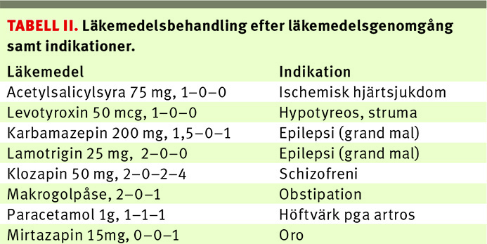 Läkemedelslistan omfattade 17 läkemedel, varav 15 skulle tas regelbundet och två var vidbehovsläkemedel. Listan inkluderade sju CNS-aktiva läkemedel (oxikodon, karbamazepin, lamotrigin, levomepromazin, klozapin, propiomazin, venlafaxin) (Tabell I). Patienten fick dosexpedierade läkemedel (ApoDos), och intaget övervakades av personalen.