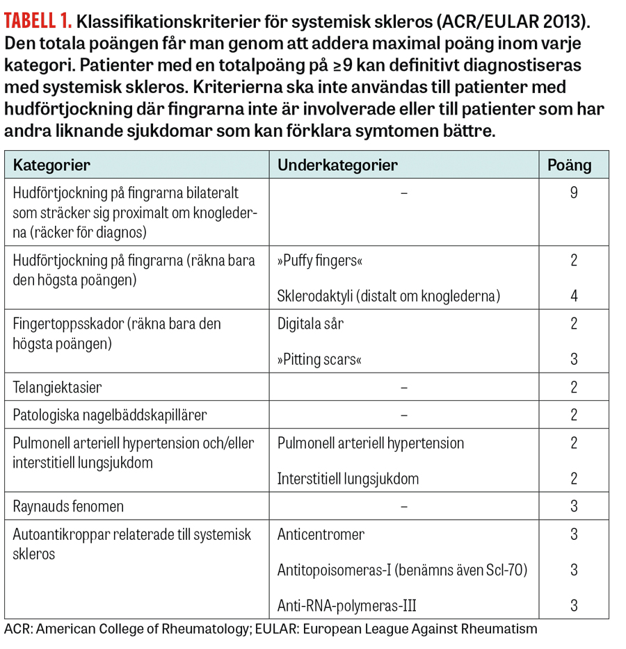 Klassifikationskriterierna uppdaterades 2013 i syfte att underlätta tidig diagnos (Tabell 1) [3]. Kriterierna tar hänsyn till de tre delkomponenterna fibros, kärlpåverkan och autoimmunitet och bygger på ett poängsystem samt baseras på kliniska, radiologiska och immunologiska fynd. Kardinalsymtomen förtjockad hud och Raynauds fenomen liksom tre autoantikroppar specifika för systemisk skleros väger tungt i den algoritm som används. Även patienter helt utan förtjockad hud kan diagnostiseras med systemisk skleros. Många av dessa patienter utvecklar manifest hudförändring först i senare skede.